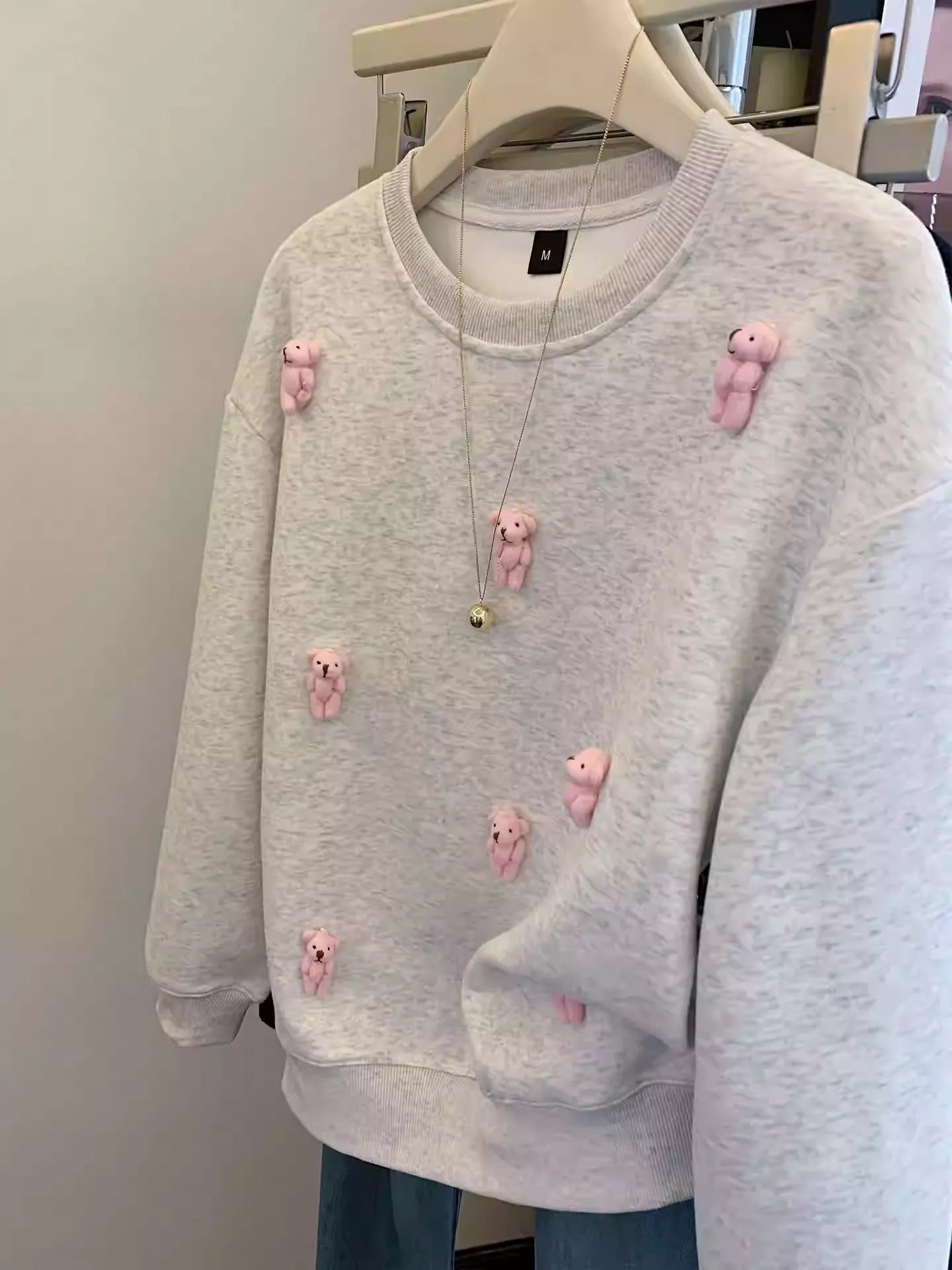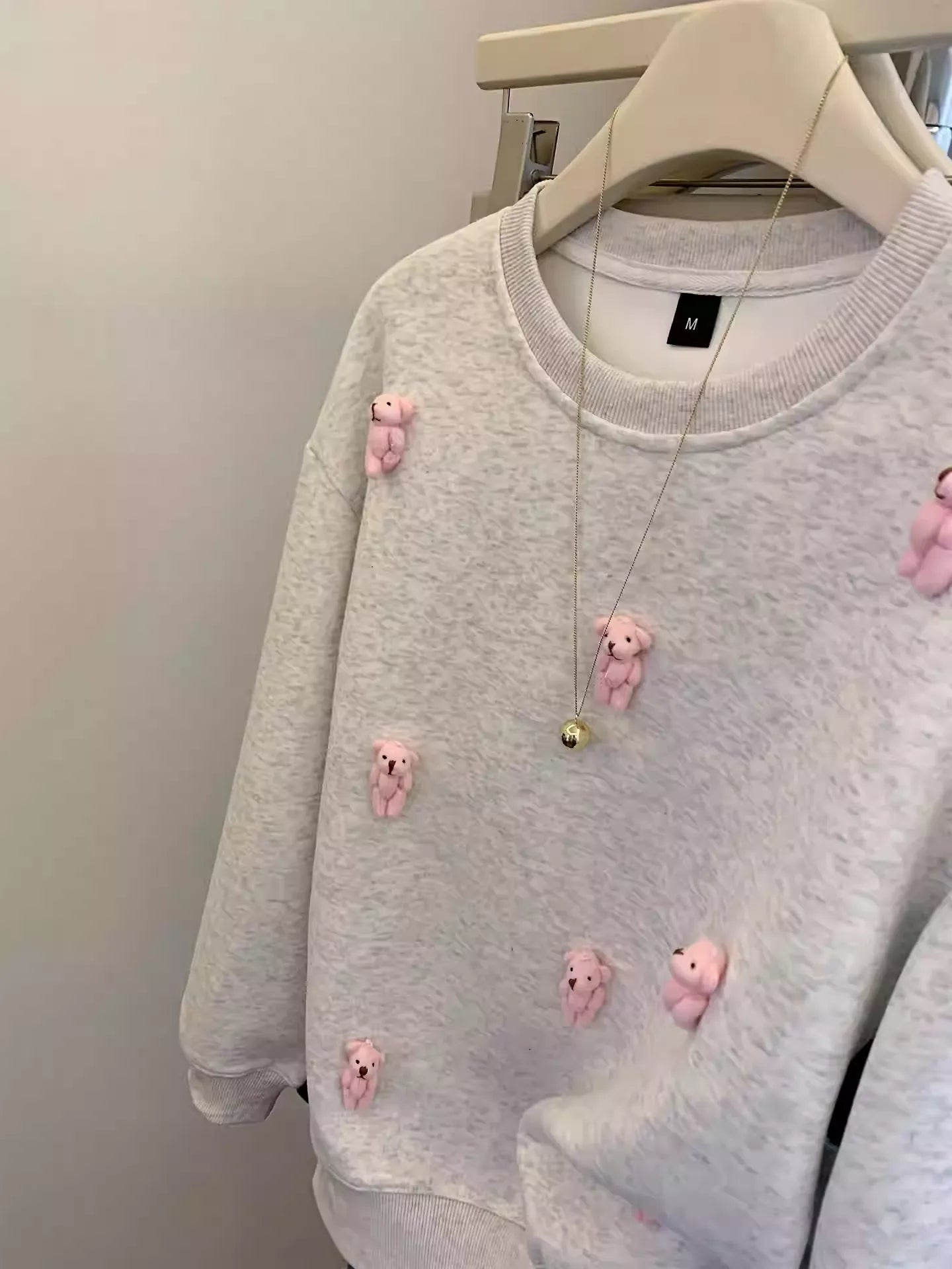 Level up your casual style with this trendy gray crew - neck sweatshirt! Multiple 3D pink bear accents give it a playful yet fashionable edge. The soft, cozy fabric makes it perfect for daily wear—whether you’re grabbing coffee with friends, strolling the mall, or lounging at home. Pair it with the gold ball - pendant necklace for an extra chic touch. It’s the go - to piece to add cute, youthful vibes to any outfit.