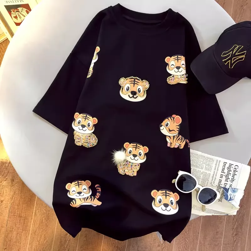 Elevate your everyday wardrobe with this uniquely designed tiger graphic tee. Combining high-end craftsmanship with a relaxed street-style fit, this isn't just a T-shirt—it's a conversation starter. Featuring adorable 3D sequin-embellished tigers and tactile pom-pom details, it brings a touch of whimsy and sparkle to any outfit.