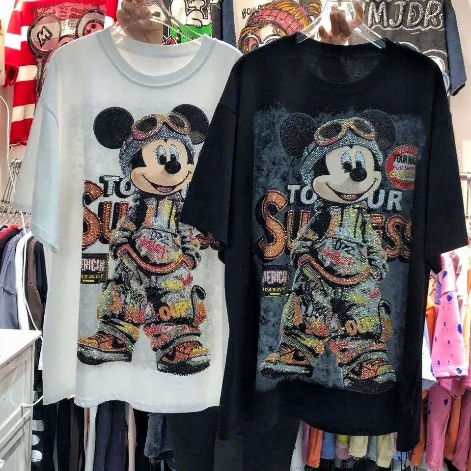 A160 - Luxury Mickey Mouse Rhinestone Graphic Tee - 320g Ultra-Heavyweight Cotton T-Shirt - Structured Boxy Fit Streetwear