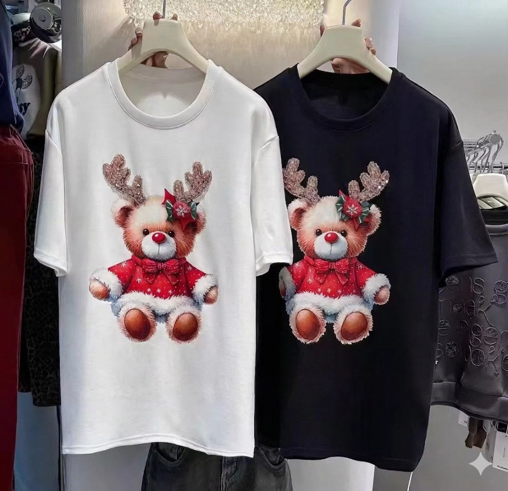 Celebrate the season with a touch of artisanal elegance. This isn't just a holiday shirt; it's a handcrafted masterpiece. Built from 220g premium high-density cotton, it provides a structured, crisp fit that perfectly balances comfort and style. The reindeer design features meticulous hand-embroidery on the antlers and scarf, further elevated with shimmering crystal beads. To complete the look, a handmade 3D holly leaf and berry ornament is delicately applied to the forehead, creating a stunning tactile effect.