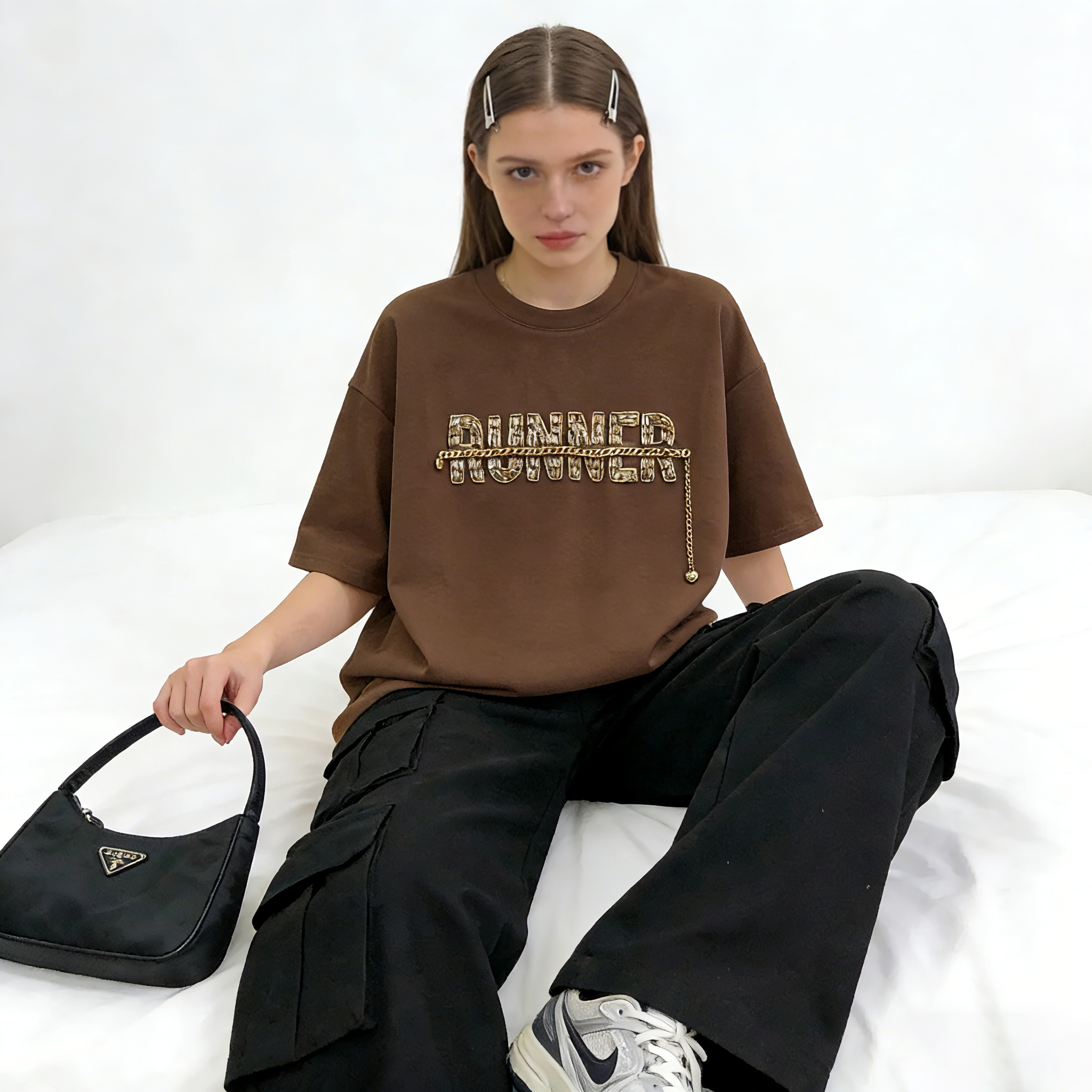 The standout feature of this tee lies in its 100% handmade rhinestone and chain detailing: Each zircon stone and metal chain is carefully positioned and secured by hand, creating a sparkling 3D letter effect with a dynamic, dangling chain accent. The rich coffee brown base adds a vintage, sophisticated touch.