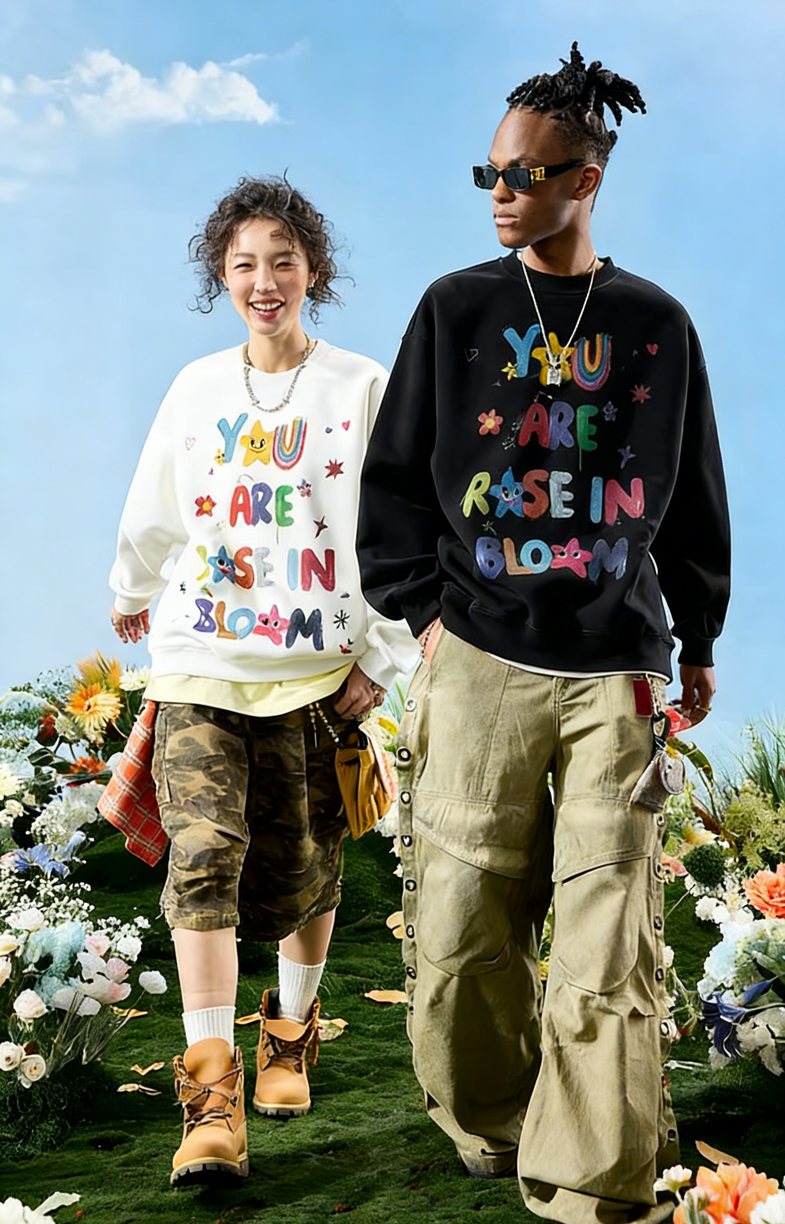 oversized hand-painted graphic sweatshirt features a vibrant "You Are A Rose In Bloom" slogan, paired with playful cartoon elements like rainbows, stars, and flowers. Crafted from premium heavyweight fleece, it blends Y2K aesthetics with a positive, uplifting message for a standout casual look.