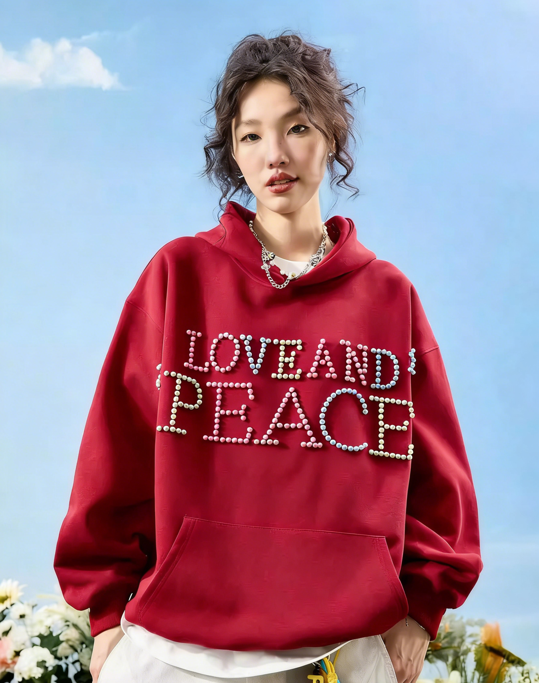 This oversized pearl-embellished "LOVE AND PEACE" graphic hoodie features vibrant multi-color pearl lettering on both the front and back, paired with the empowering "Make a Choice" slogan. Crafted from premium heavyweight fleece, it blends Y2K aesthetics with a message of positivity for a standout casual look.