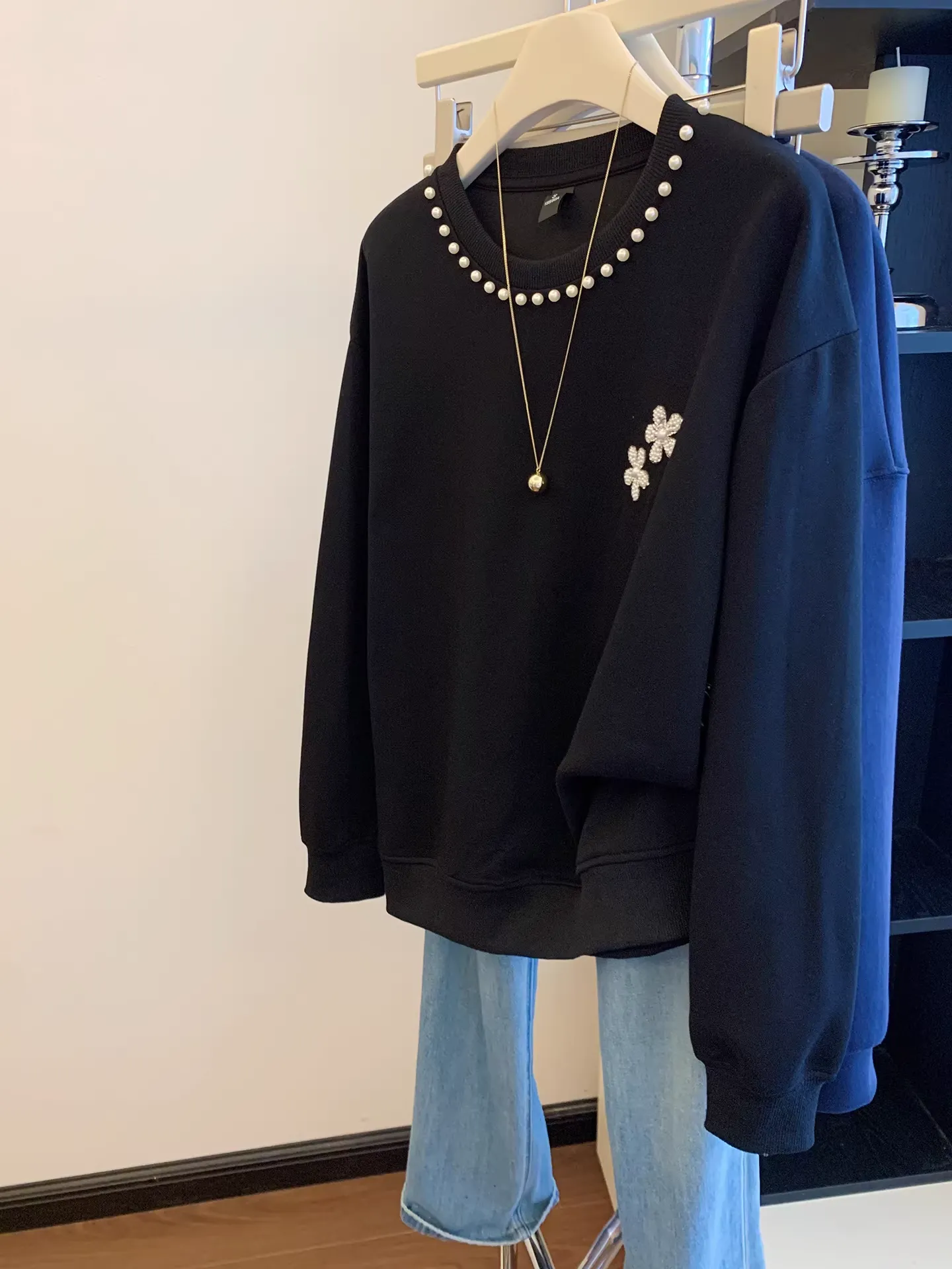 This oversized crewneck sweatshirt redefines casual elegance, featuring hand-applied pearl embellishments along the neckline and a delicate floral accent on the chest. Crafted from premium ring-spun cotton, it offers a soft, structured feel that holds its shape, while the relaxed, slouchy fit flatters all body types. Perfect for elevating everyday outfits, it seamlessly transitions from coffee runs to dinner dates with a touch of feminine charm.