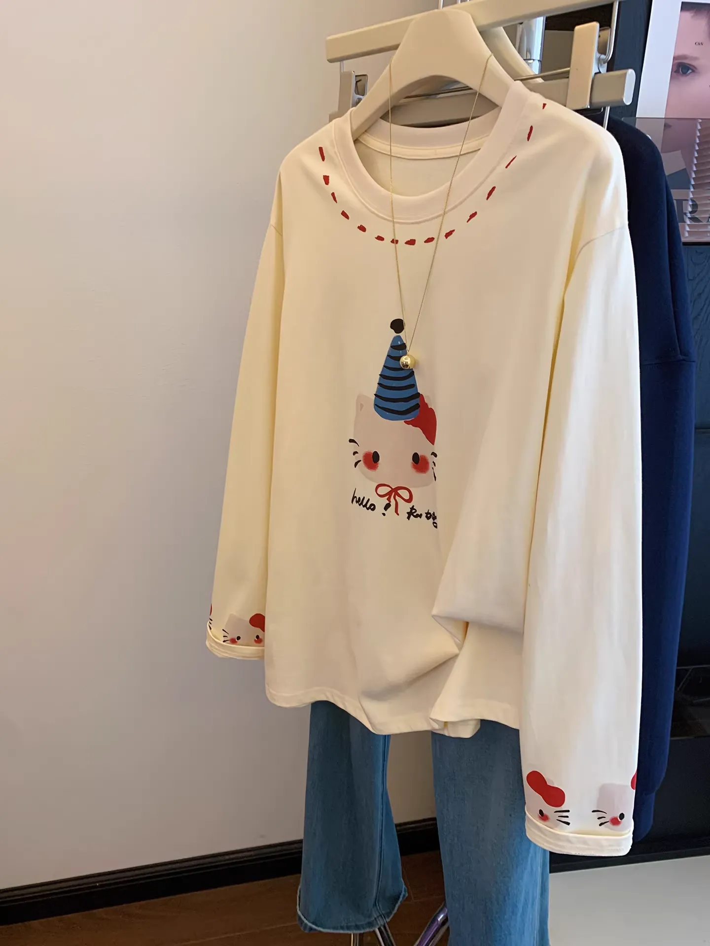 This oversized long sleeve tee is a 2026 must-have for lovers of cute, nostalgic style. It features a whimsical cat graphic wearing a party hat, paired with the playful phrase “hello! fun day”, plus delicate heart accents along the neckline and cuffs. Crafted from premium ring-spun cotton, it offers a soft, breathable feel and a relaxed, slouchy fit that flatters all body types. Perfect for everyday wear, it effortlessly blends Coquette charm with Y2K revival vibes, making it ideal for school, coffee runs, or casual hangouts.