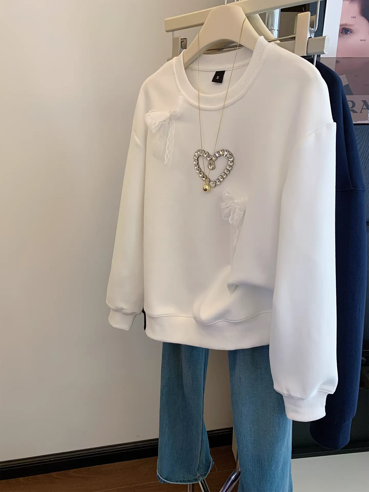 This oversized black crewneck sweatshirt is a 2026 must-have for lovers of the Coquette aesthetic, featuring hand-applied lace bows and a pearl-embellished heart detail. The soft, premium fabric offers a relaxed, slouchy fit that flatters all body types, while the romantic lace and pearl accents add a touch of feminine elegance to casual outfits. Perfect for everyday wear, it seamlessly transitions from coffee runs to dinner dates, embodying the trendy “soft girl” vibe dominating 2026 fashion.