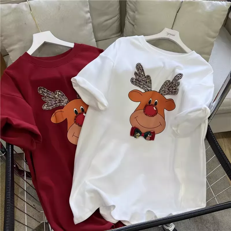 A81 - Christmas Reindeer Bowcore Tee | Hand-Beaded 3D Bow Aesthetic T-Shirt | Festive Coquette Top