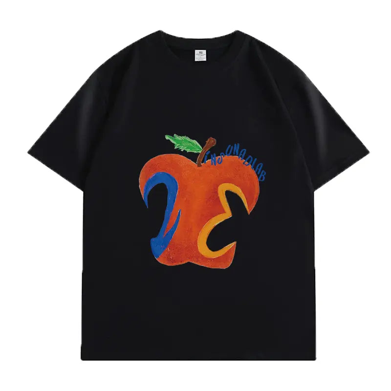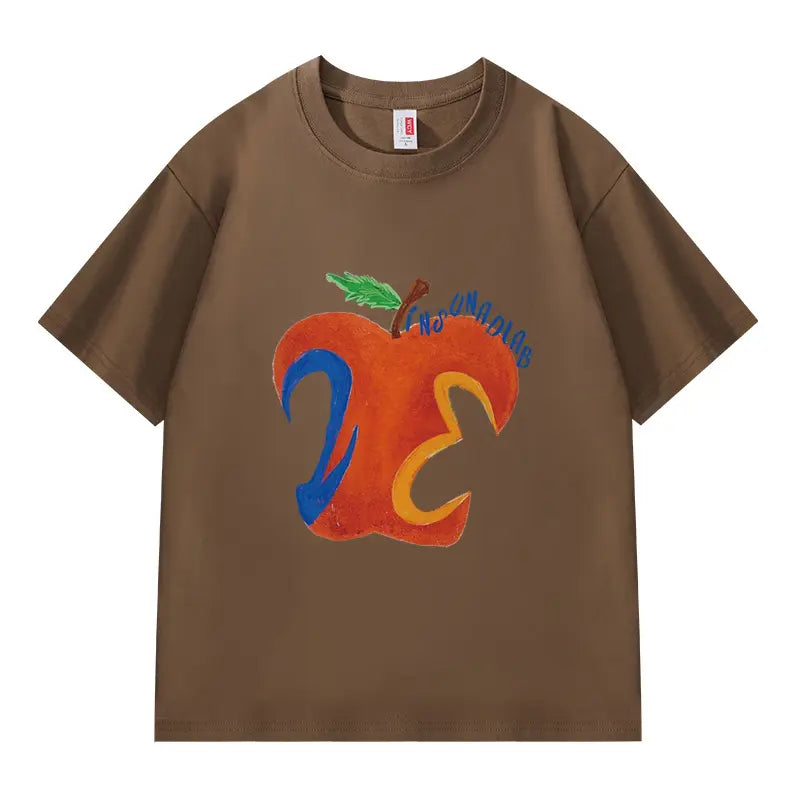 This VINESU white T - shirt features an apple pattern drawn with vintage abstract strokes. The contrasting - color number “23” breaks the routine, full of artistic flavor. The apple element brings a fresh and vibrant touch, combined with the unique font design. The loose fit suits daily wear, blending vintage and trend, art and practicality. Wearing it easily creates a casual yet distinctive dressing style, an eye - catching item to show personal aesthetic.