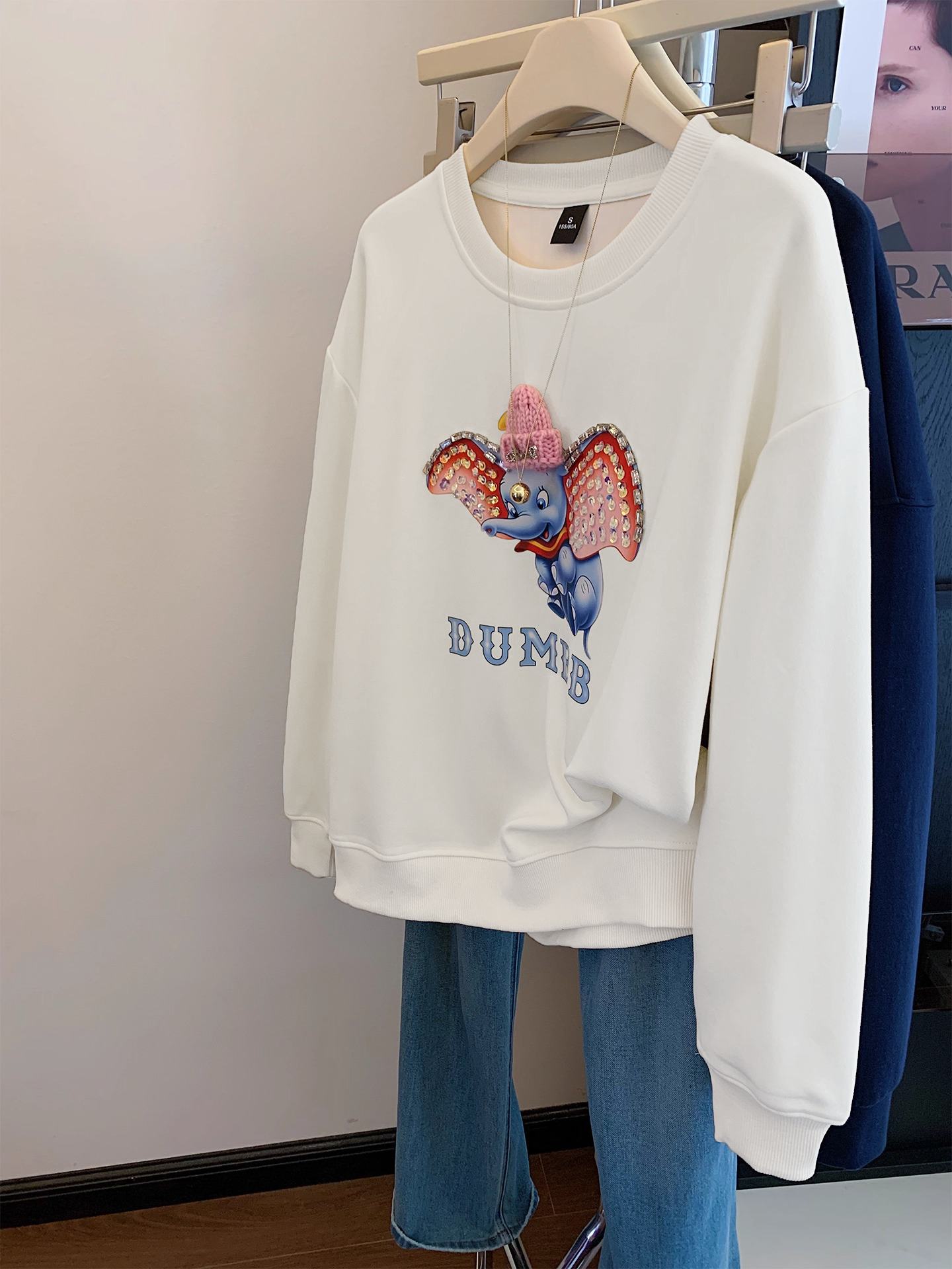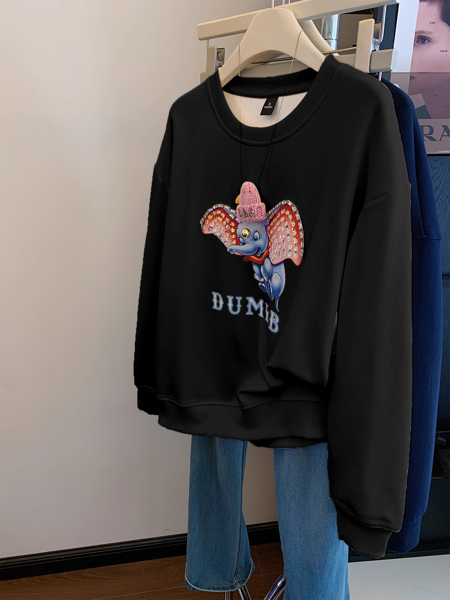 Put it on and dive into a fairy tale in a second! This Dumbo - themed sweatshirt features a gentle and versatile creamy white color, easily matching various styles. The iconic Dumbo pattern comes to life on the garment. Its big ears are adorned with shiny rhinestones that shimmer slightly with your movement, reflecting a dreamy glow as if imbued with magic. What's even better is that Dumbo wears a three - dimensional plush beanie. The soft texture and meticulous details make it playful and delicate. Whether you're going out casually or relaxing at home, it allows you to showcase your unique charm in comfort, stand out in a crowd, and easily catch people's eyes~