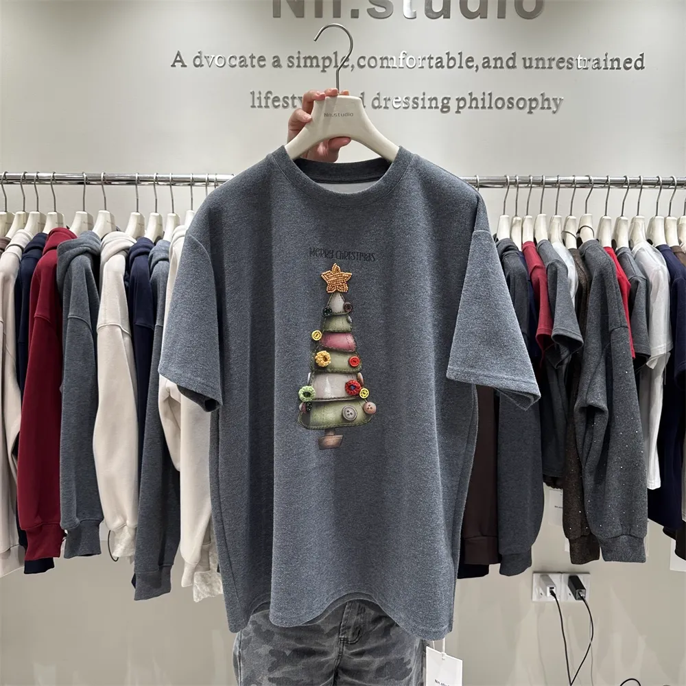 It features a 3D Christmas tree embellishment design — details like stars and buttons are crafted with heavy-duty techniques, bringing tactile texture and polished charm that screams holiday spirit.Crafted from 300g 100% cotton, it's soft yet structured: skin-friendly, breathable, and perfect for both daily wear and holiday gatherings.