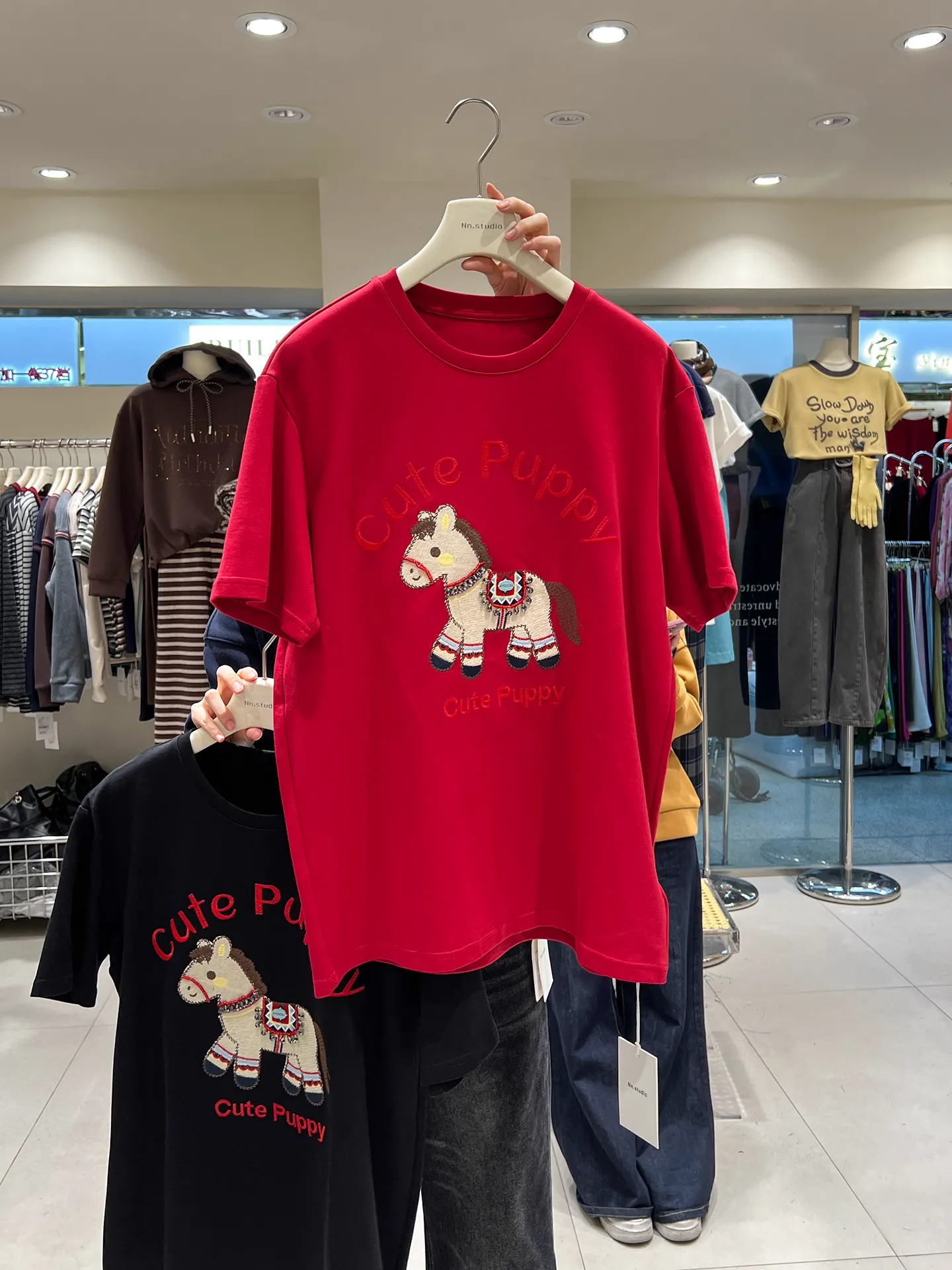 The standout detail is the "Cute Puppy" pony-themed embroidery on the chest: 3D embroidery brings the cute pony to life, paired with rhinestone accents, color-blocked patterns, and a tiny "FASHION" label. It's highly detailed, has a distinct 3D texture to the touch, and easily catches the eye.