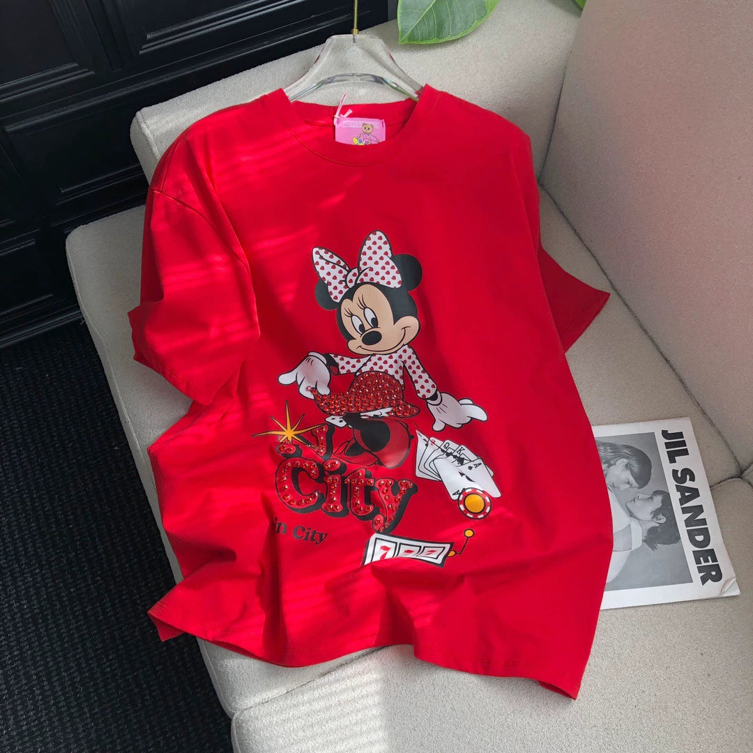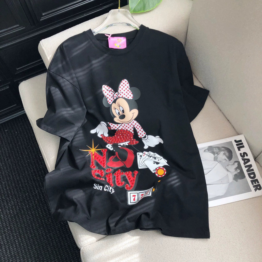 This isn’t just a T-shirt—it’s a retro vibe with a twist! Featuring a classic Minnie print and 3D diamond accents, it’s like wearing a piece of art (that you can totally wash). Perfect for turning heads and sparking conversations. 🖤✨