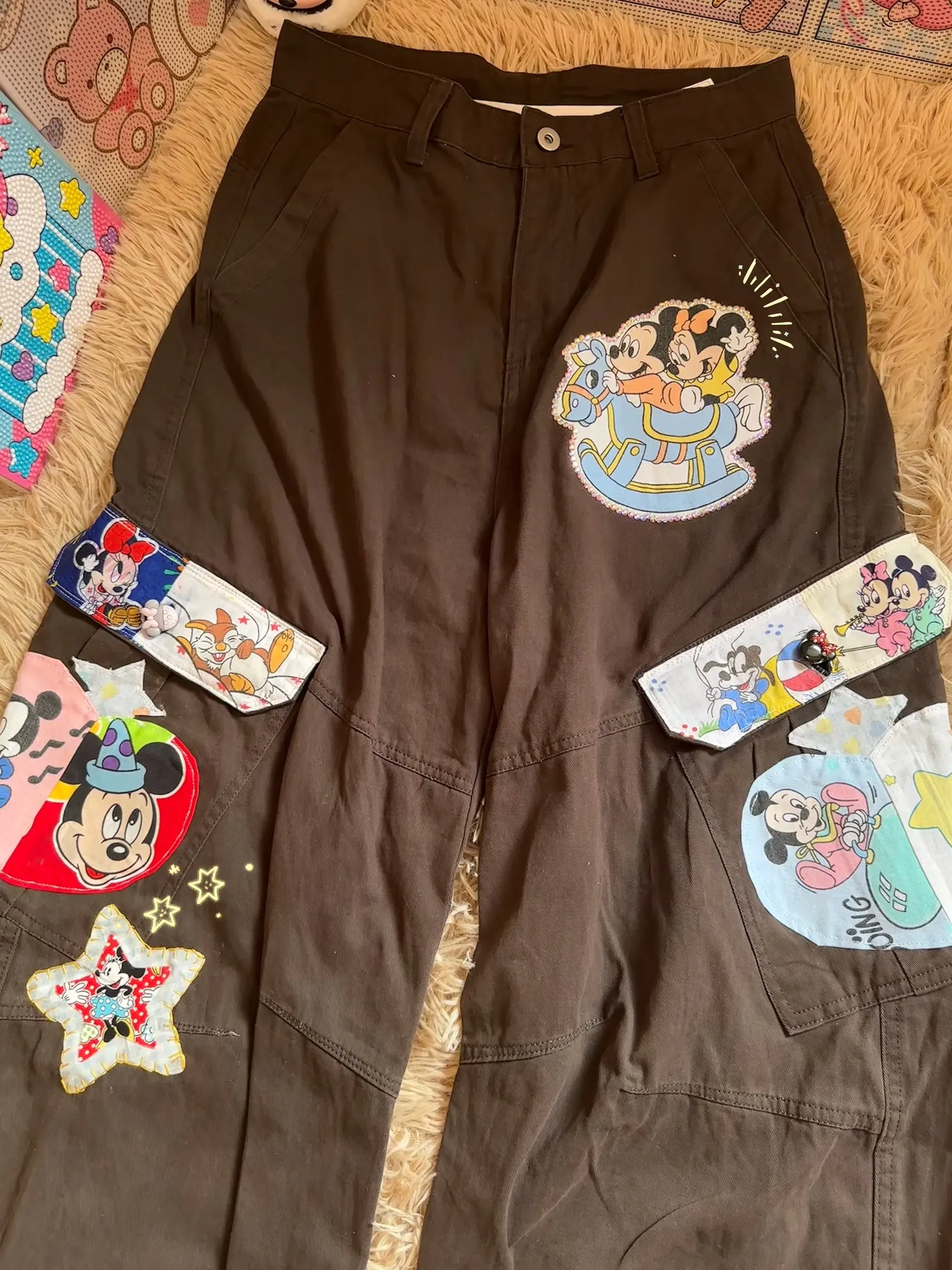 These aren't just cargo pants; they’re a walking "Disney Comic World". Through high-density patchwork craftsmanship, classic characters like Mickey, Minnie, Goofy, and Pluto are playfully scattered across the trousers. The vintage earth-brown tone paired with vibrant colorful patches perfectly balances American retro vibes with modern streetwear.