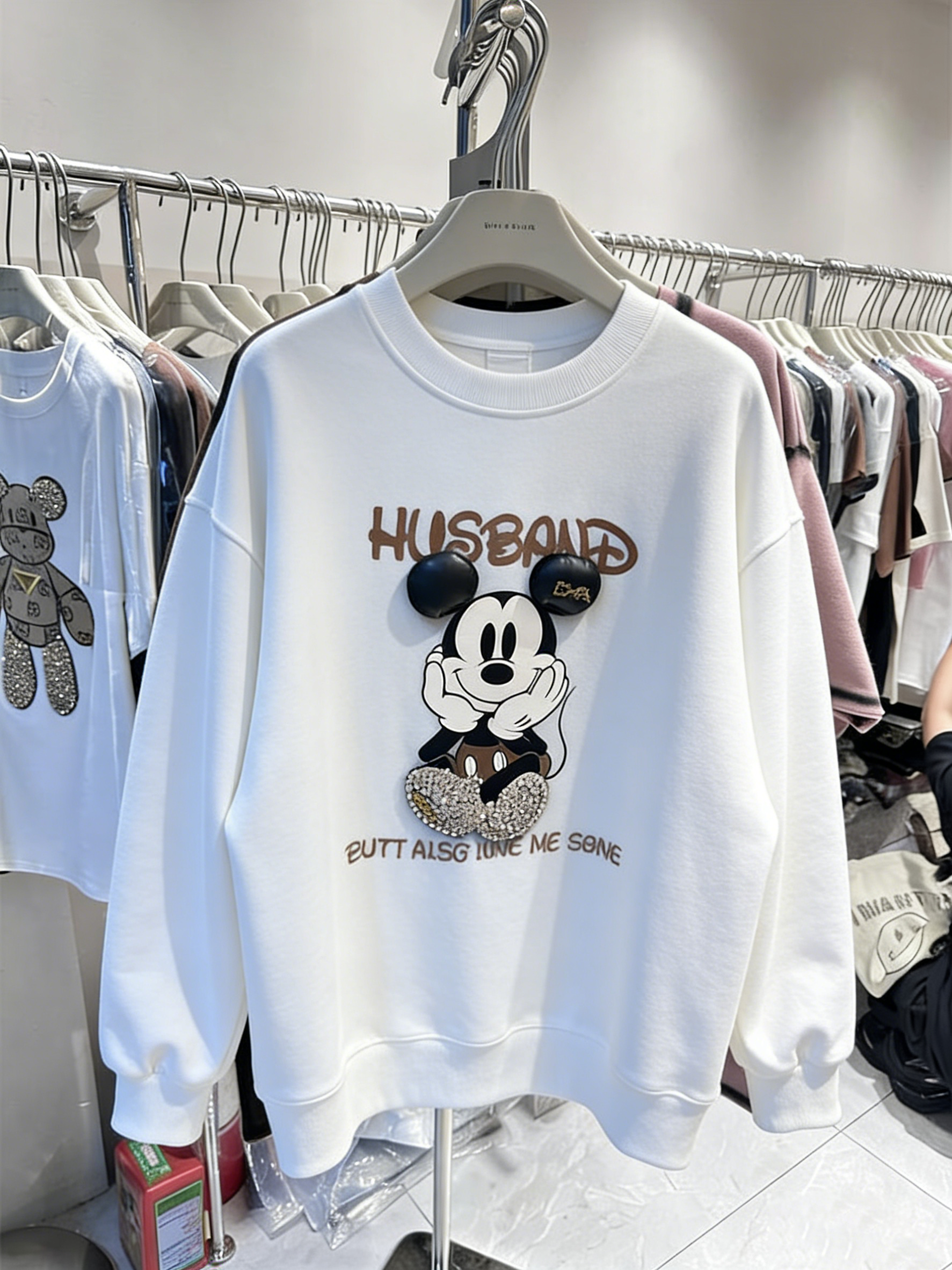 Must-have for street-style lovers: this Rhinestone Mickey Sweatshirt is here! Its 3D rhinestone craftsmanship outlines a cute Mickey design, paired with bold lettering— it sparkles and catches eyes under light. The fit flatters all body types, effortlessly delivering a casual, laid-back vibe. With a sweet-cool style, it works for daily commutes, friend hangouts and more— you’ll easily stand out!