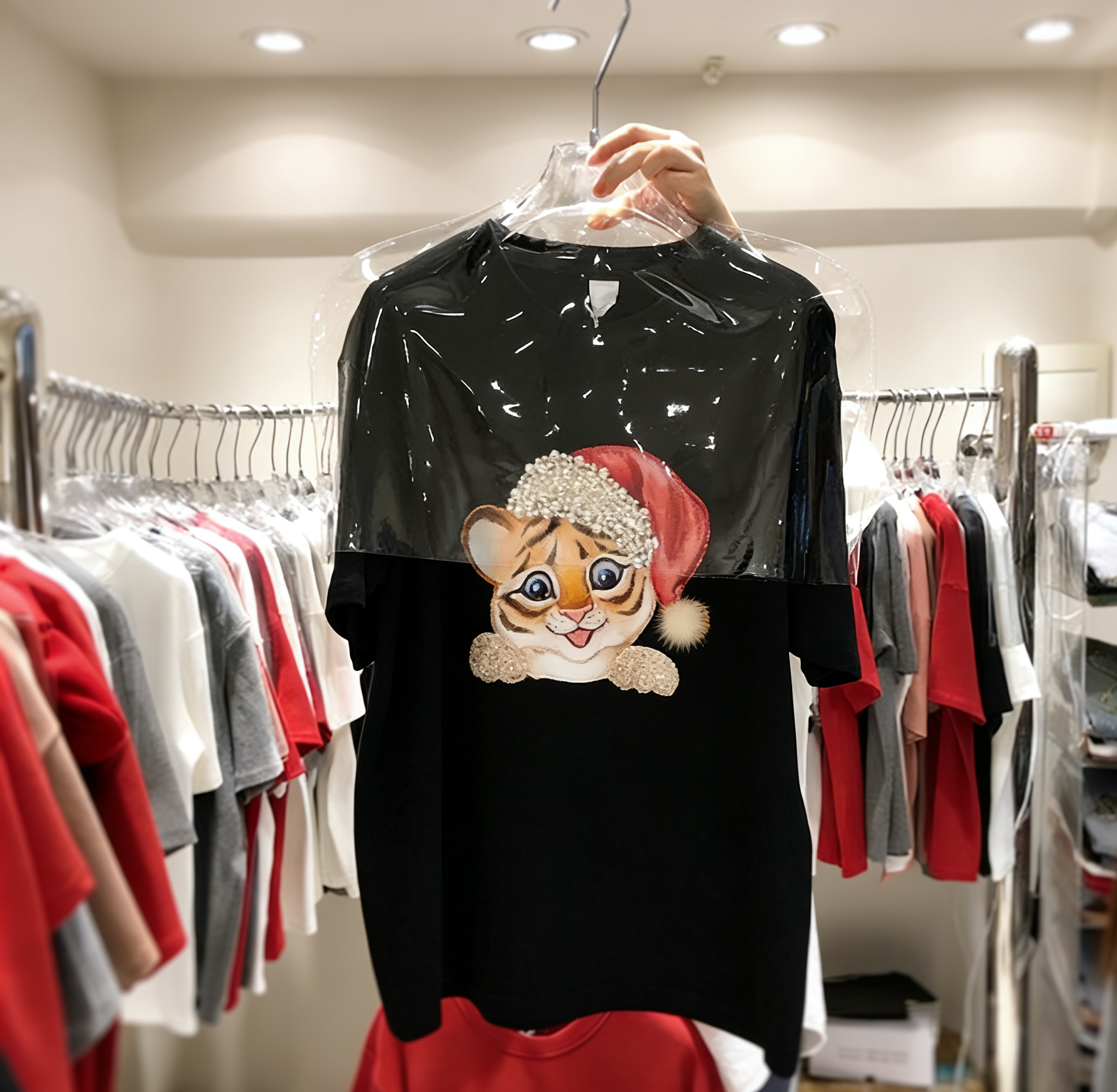 VINESU A03 - Christmas Tiger Pearl & Crystal Embellished 220g Cotton Oversized Tee