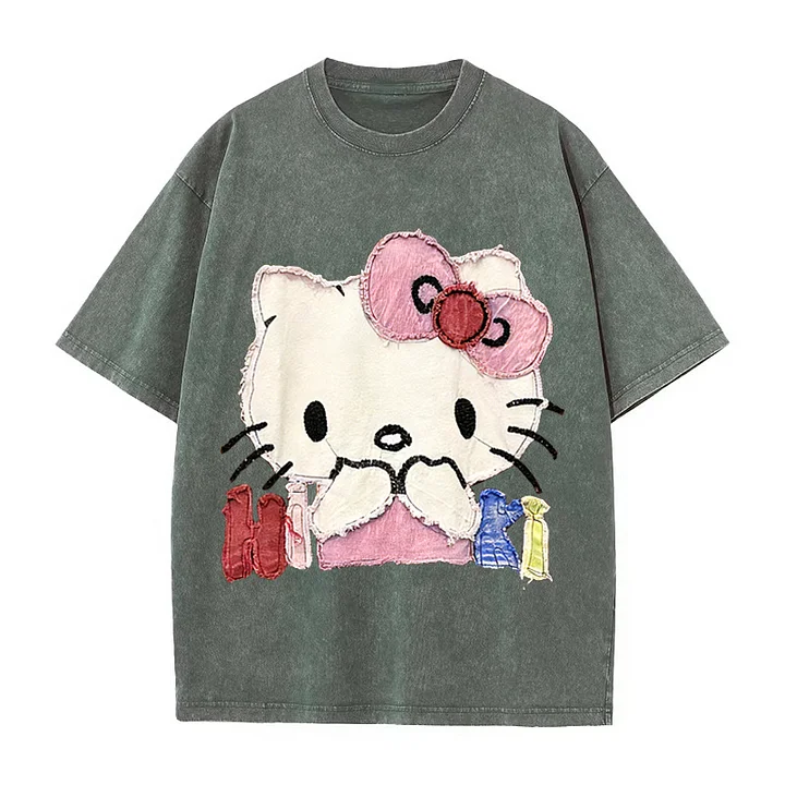 VINESU A401 - Vintage Washed Hello Kitty Patchwork Tee - Heavy Detail Cotton T-Shirt