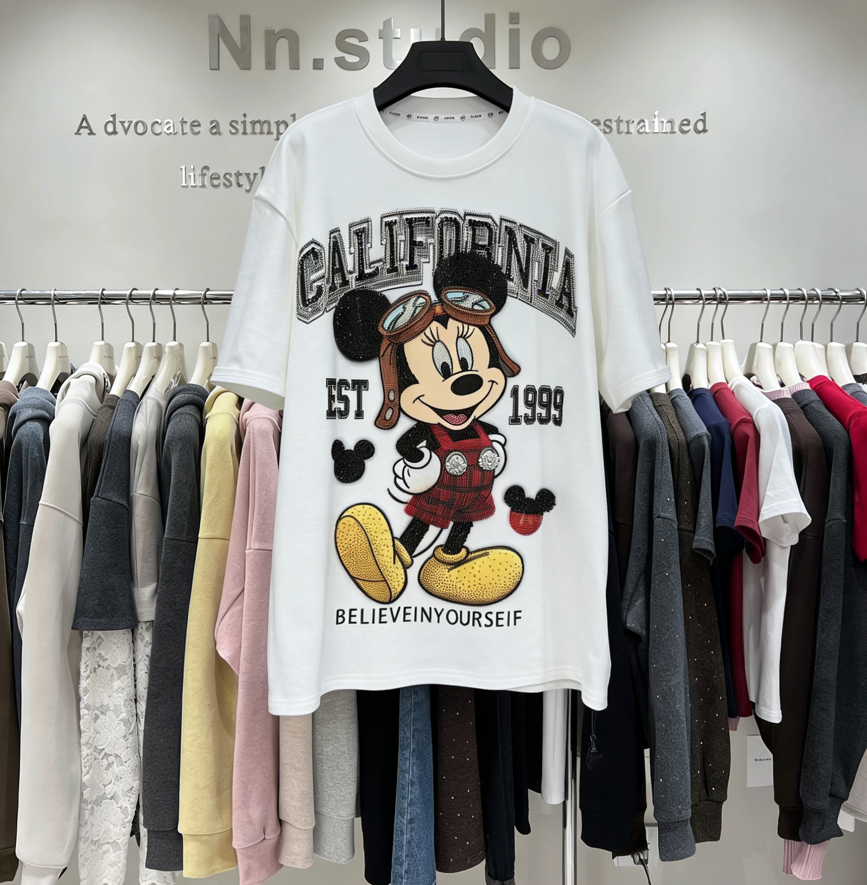 Adorned with high-density sparkling rhinestones that cover the iconic California lettering and the classic character's aviator goggles, this top delivers a luxe, bling effect that catches light from every angle. The retro graphic print features a nostalgic cartoon icon in a stylish aviator look, paired with “California EST 1999” and motivational lettering for a cool-girl aesthetic.