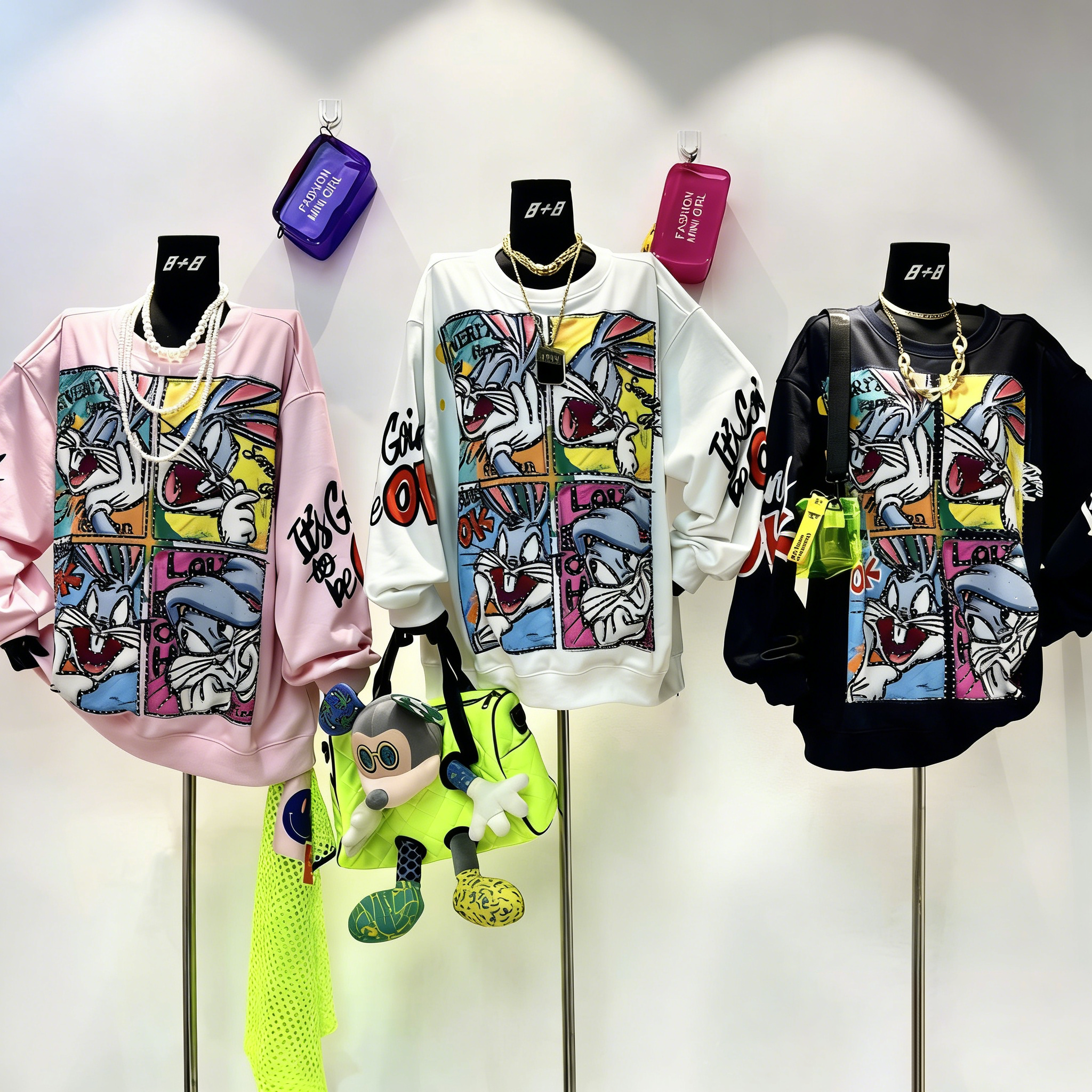Featuring a vibrant 4-panel pop art print of the iconic bunny character, this oversized pullover is elevated by hand-applied rhinestones that catch the light for a subtle, luxurious sparkle. Made from a soft, mid-weight fabric, the relaxed fit ensures all-day comfort, making it perfect for pairing with high-waisted jeans or leggings to nail that retro Y2K streetwear vibe.