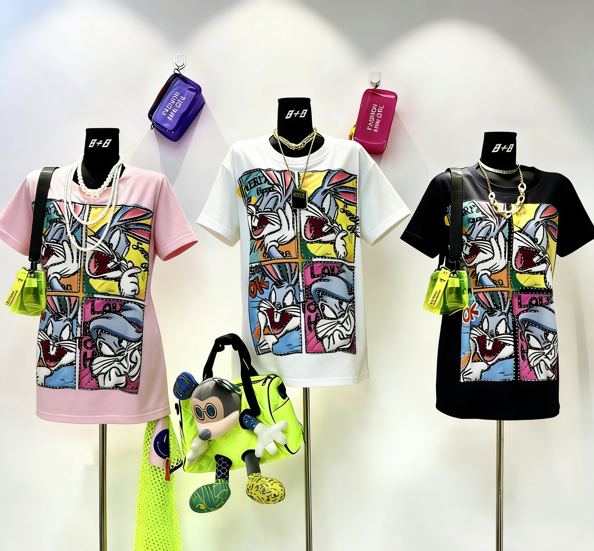 This eye-catching oversized tee features a vibrant 4-panel pop art print of the iconic bunny character, elevated by hand-applied white rhinestones that add subtle sparkle and texture. Made from premium 220g cotton, it offers a soft, breathable feel and relaxed fit for all-day comfort. Available in pink, white, and black to suit any casual or streetwear look.