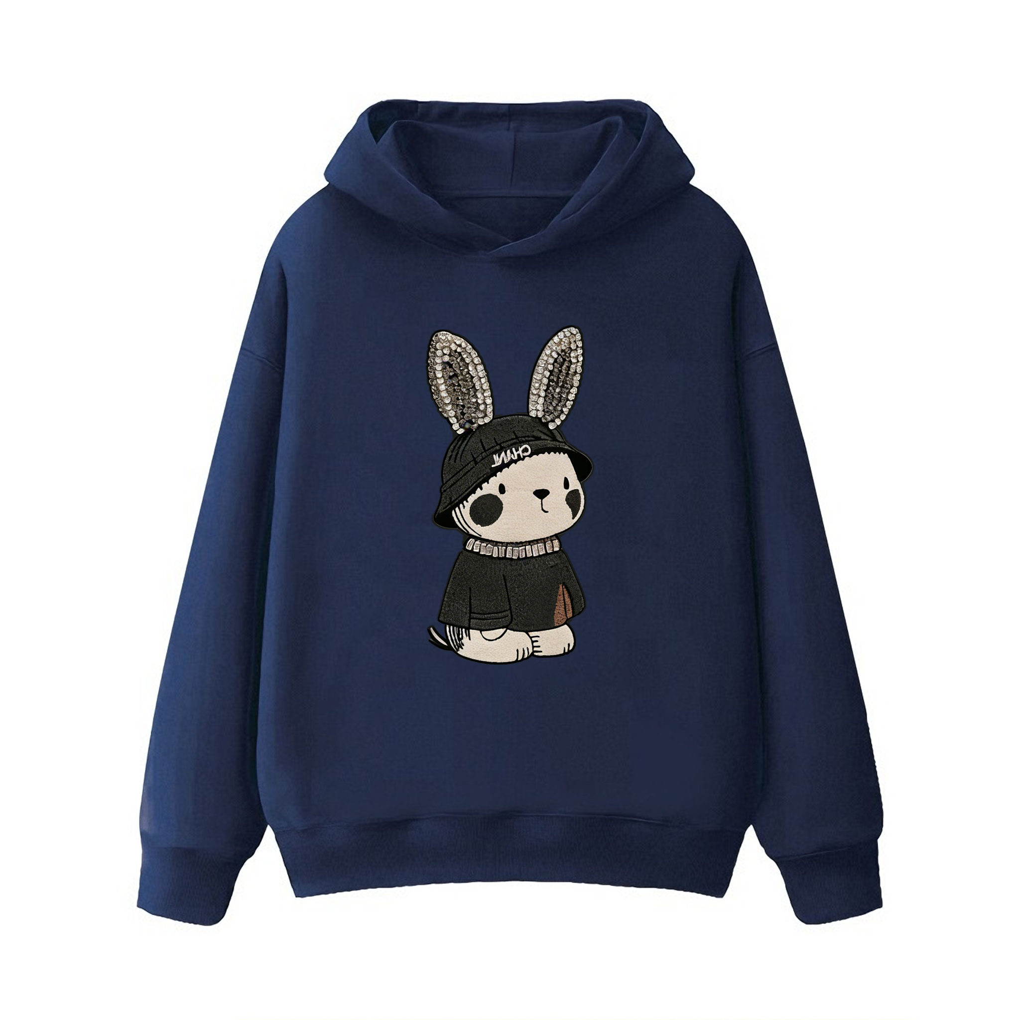 Crafted with 3D embroidery (non-print for finer, more durable texture) to create an adorable bunny design, its ears are accented with rhinestones that sparkle under light. The loose hoodie fit suits all body types, offering comfort and a laid-back vibe. Blending sweet, cool, and cute styles, it’s perfect for street outings, lounging at home, or meals with friends—effortlessly nail the age-reducing vibe!