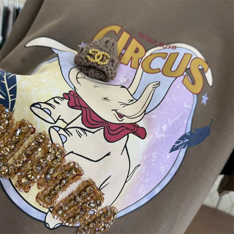 Eye - catching Details: Dumbo wears a real knitted hat on its head, and you can feel the fine and soft knitted texture, which is of great quality. There are also delicate golden decorations on the hat, instantly enhancing the overall fashion sense✨. At the same time, the T - shirt is dotted with shining rhinestones that sparkle under the light, adding a touch of glamour to the overall look.