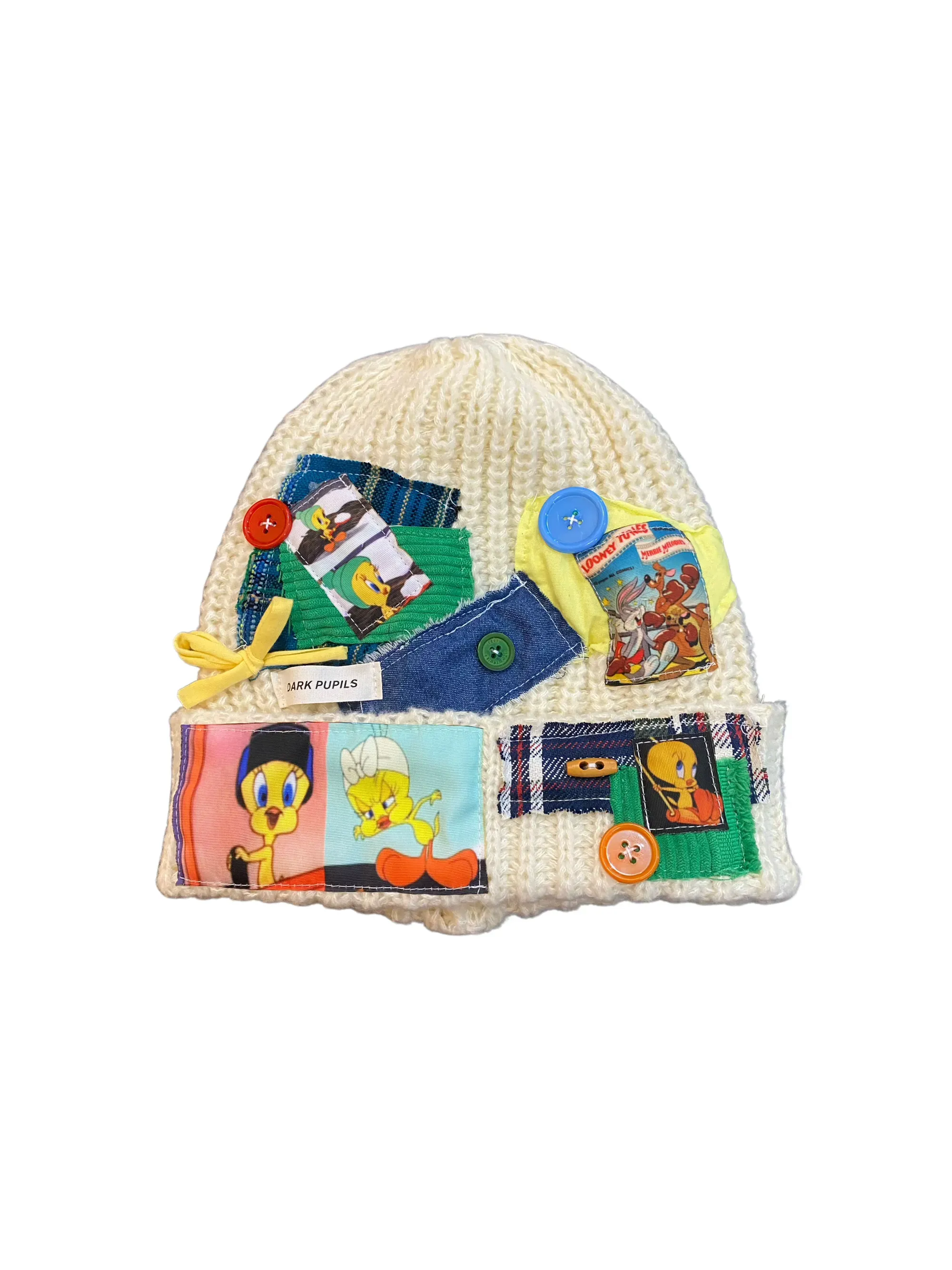 Vinesu H8 - Vintage Teddy Bird Patchwork Knit Beanie | Handmade 1-of-1 Reworked Winter Hat 🤍White