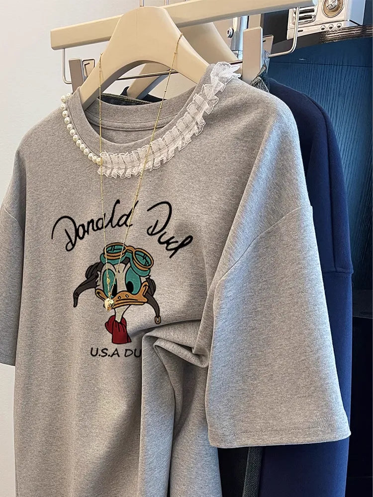 VINESU Slate Gray Lace-Trimmed T-Shirt with Hand-Sewn Beadwork