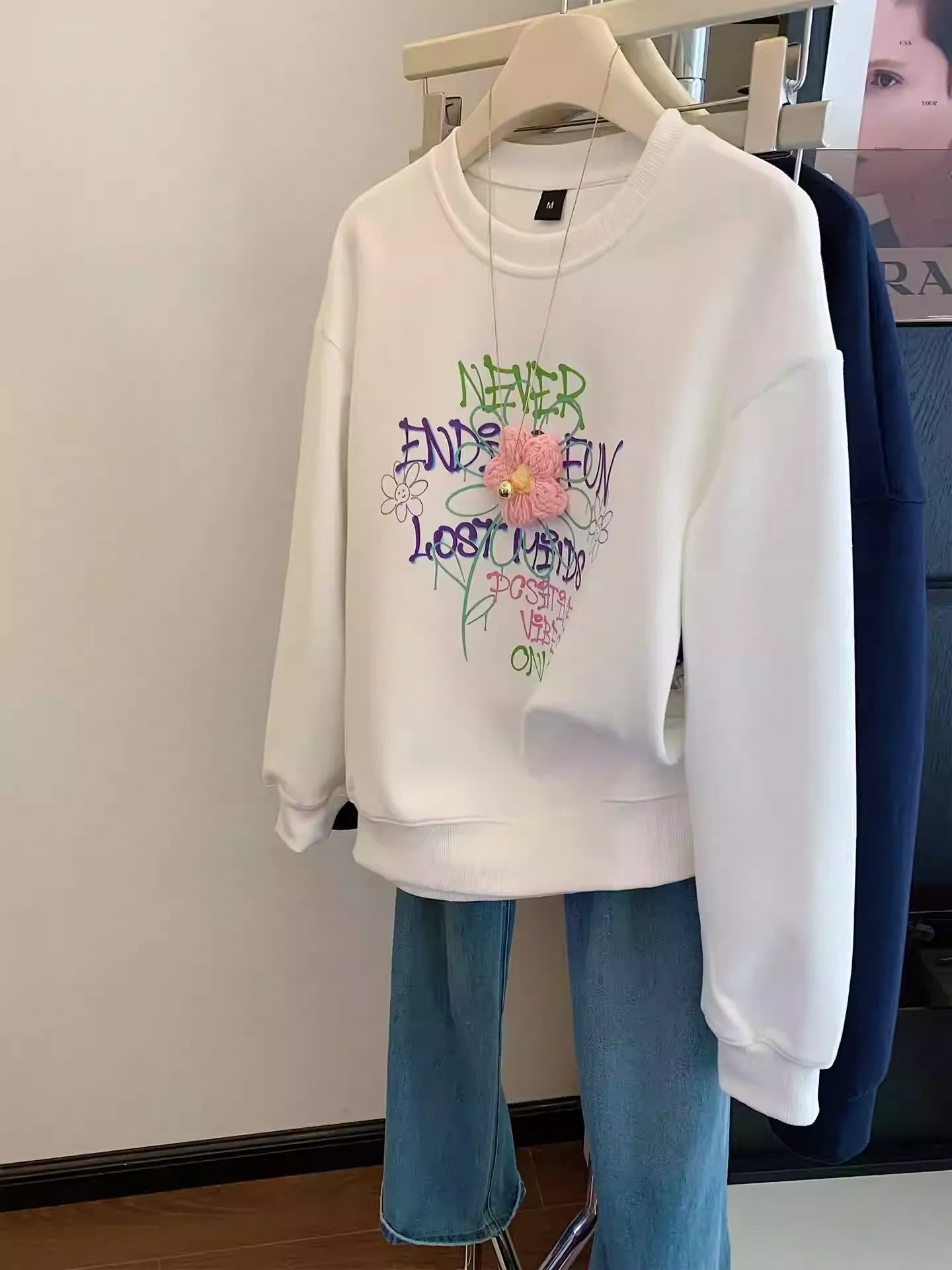 Want to wear “artistic + sweet fun” style? This white crew - neck sweatshirt is a winner✨! Colorful artistic letter prints (words like “NEVER”“ENDS”“FUN” hide life attitudes) match 3D hand - crocheted pink flowers (tiny gold beads on stamens are perfect details). The loose fit suits all body types—fresh for single wear, layered for depth. Pair with a necklace for extra elegance. Whether it’s a citywalk or lazy home days, slip it on and easily nail the “casual yet unique” vibe!