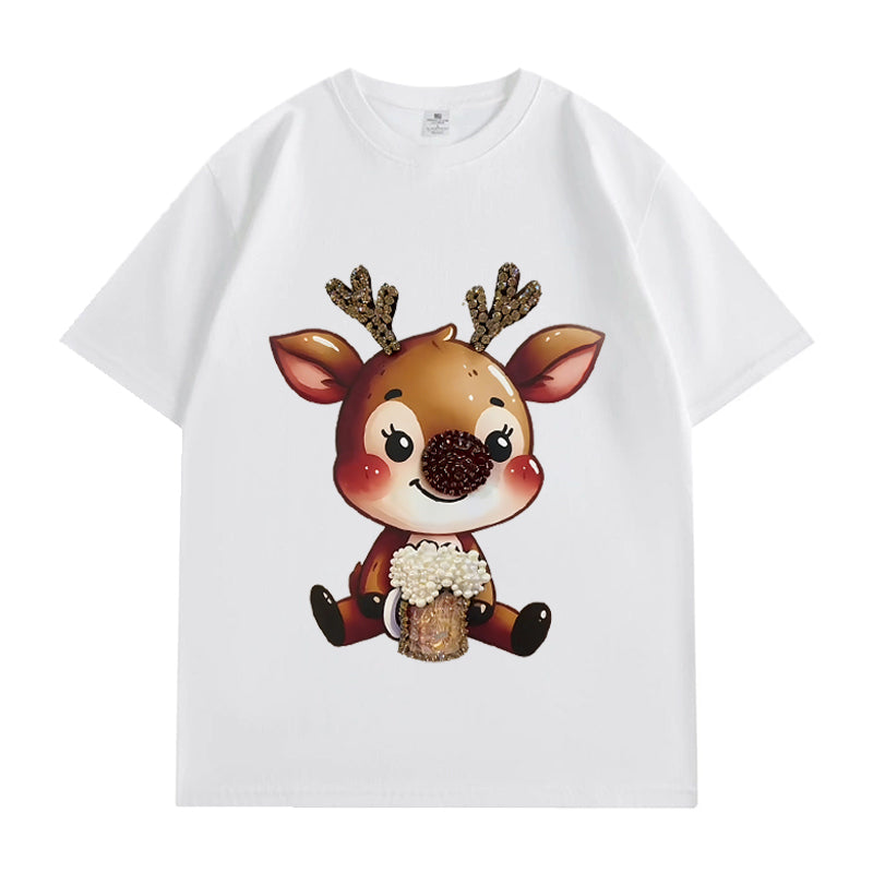 VINESU Y451 - 3D Beaded Reindeer Vintage Washed Short Sleeve Tee