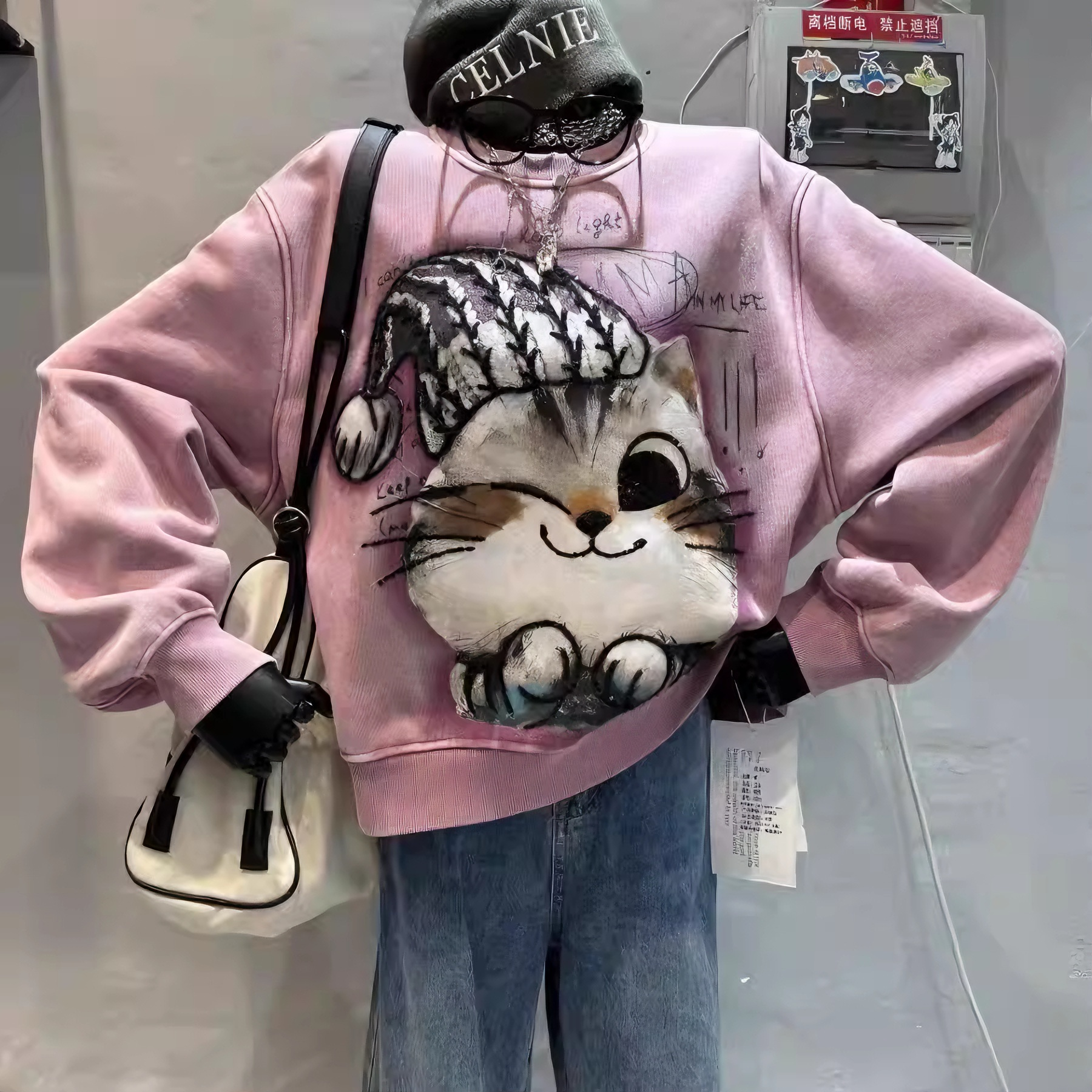 Y278 - Vintage Pink 3D Cat Embellished Sweatshirt | Handmade Graphic Crewneck Pullover